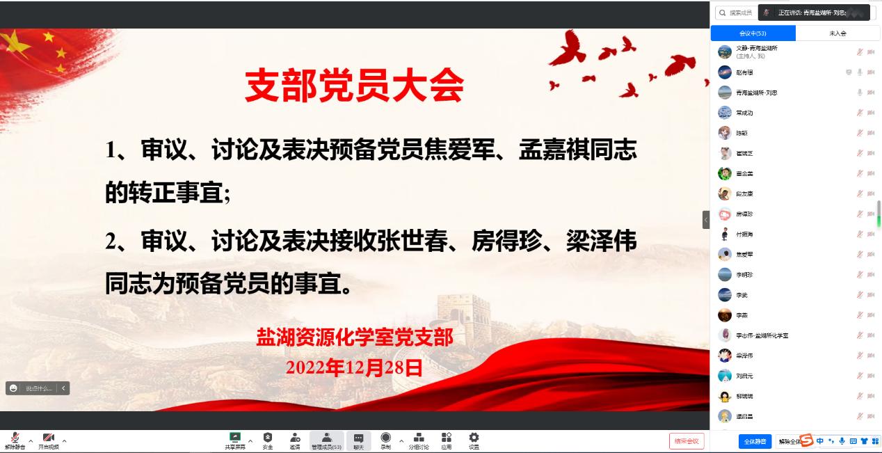 12月28日,盐湖资源化学实验室党支部召开支部党员大会,会议的主要议题有:(一)审议、讨论及表决预备党员焦爱军、孟嘉琪同志转正事宜;(二)审议、讨论及表决接收张世春、房得珍、梁泽伟同志为预备党员事宜。会议由支部书记刘忠主持,支部全体党员采取视频会议形式参加了本次会议。