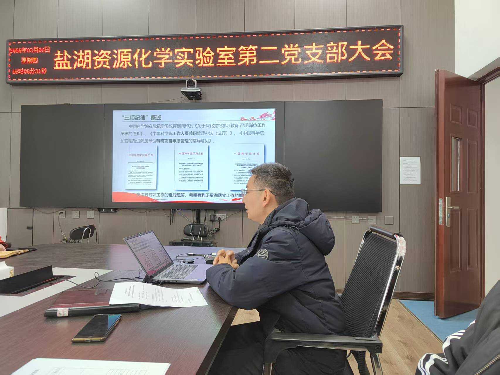 刘忠做了《深入理解“三项制度”,抢占盐湖科技制高点》的主题报告,主要从中国科学院在党纪学习教育期间印发的《关于深化党纪学习教育,严明岗位工作纪律的通知》、《中国科学院工作人员兼职管理办法(试行)》、《中国科学院加强和改进院属单位科研项目申报管理的指导意见》三项制度文件出发,深入学习领会习近平总书记重要论述和讲话精神,通过“三项制度”的宣贯,使支部党员对中国科学院的“三项制度”有了更加深入的理解,增强了广大党员职工遵规守纪的自觉性和主动性,为加快抢占盐湖科技制高点提供有力的支持与保障。
