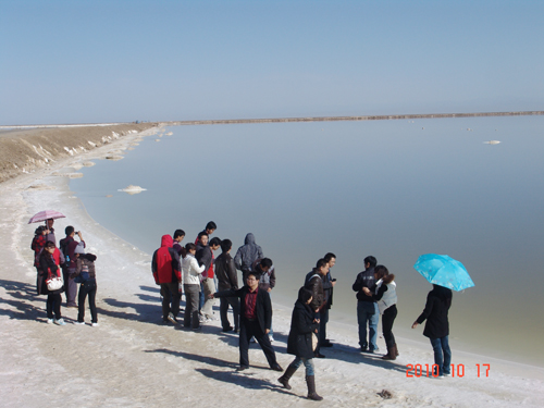 随后,同学们又参观了雄伟壮观的大盐田,盐田里形成了形态各异,鬼斧神工一般的盐花。盐花或形如珍珠、珊瑚,或状若亭台楼阁,或像飞禽走兽,一丛丛,一片片,一簇簇地立于盐湖中,把盐湖装点得美若仙境,令同学们人赞叹不已。蓝天白云、山色、湖光湖水、盐晶融为一体,景致极美,让人留恋忘返。18日,大家带着未尽的余兴踏上了归程。