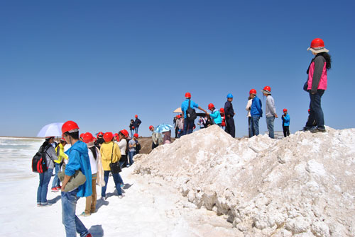 在察尔汗盐湖,参观了一望无际的大盐田,大家被盐湖壮观、美丽的景色所倾倒,纷纷拍照留念。在参观察尔汗国家矿山公园博物馆时,博物馆以大量丰富、翔实的图片文字,介绍了中国盐湖的分布、盐湖的形成和盐湖的类型,展现了察尔汗盐湖钾肥生产的发展历程。通过柴达木盐湖沙盘、盐湖工业区模型等,勾勒出一幅盐湖综合开发循环利用的广阔前景。