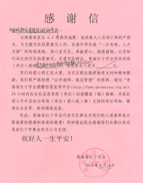云南鲁甸发生6.5级强烈地震后,造成了重大人员伤亡和财产损失。为支援灾区抗震救灾工作,弘扬中华民族“一方有难、八方支援”的传统美德,青海盐湖所工会积极动员和组织广大职工捐款捐物,总计捐款23535元整,以实际行动支持灾区抗震救灾,关爱灾区群众。
