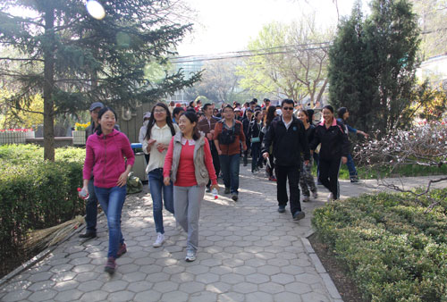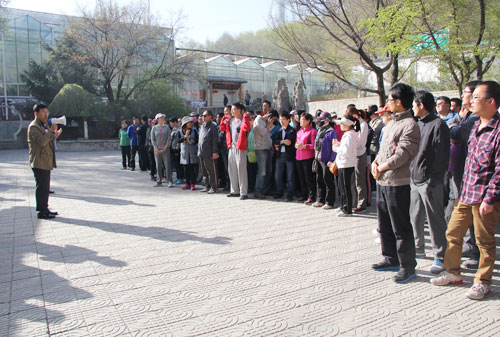 早上9点全所职工和研究生集合在西山植物园广场,主持全所工作的副所长段东平做了简洁的讲话,鼓励大家要把工作和锻炼结合起来,使健康的身体成为快乐的生活、工作和学习的基础。同时在五一劳动节到来之际,代表所领导班子祝大家节日快乐。