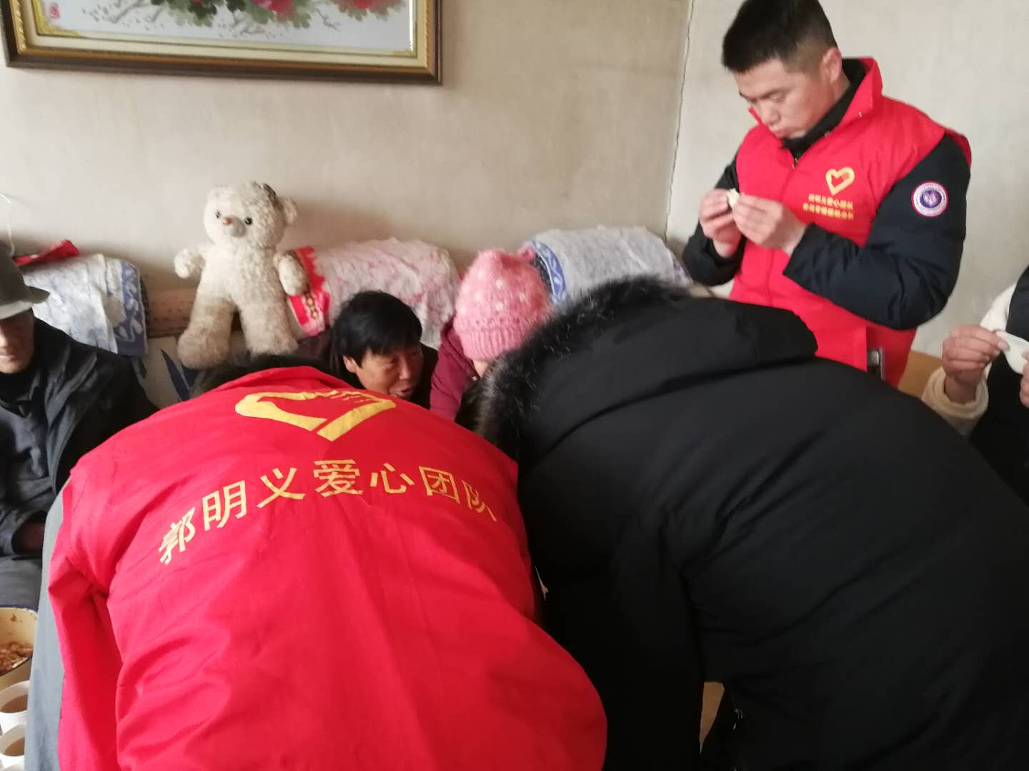 午饭后大家开始唠家常,在与一位老奶奶交谈中得知她是一位五保户,老伴和两个儿子都不幸去世,唯一的孙女远嫁甘肃,不能在身边照顾,一年也回不了一次,生活很是孤单。看到爱心团队,她很高兴,脸上一直挂满笑容。郭明义爱心团队帮扶这位老奶奶的第三个年头了,她和本次志愿者领队很熟悉,亲切称领队为大儿子。临走时,老奶奶一直站在门口,不停地挥手告别,久久不愿回屋。