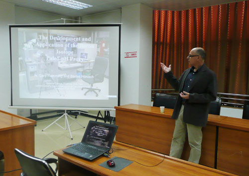 Gary Hemming作了题为《The development and application of boron isotope paleo-pH proxy》的报告,报告由重点实验室副主任韩凤清研究员主持,并由赖忠平研究员进行现场翻译讲解。Prof. Gary Hemming通过生动的图片和翔实的数据,向我们展示了他将硼同位素运用到古海洋pH重建的过程。