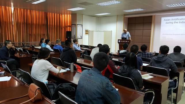 Guillaume做了题为“Asian aridification and Monsoons during the India-Asia collision(印度-亚洲板块碰撞过程中的亚洲干旱化和季风演化)”的报告。Guillaume首先讲解了其研究团队在新疆塔里盆地做的始新世4100万年以来特提斯海的退缩过程和5次海侵时间。之后讲述了其研究团队和我国科学家一起合作在西宁盆地做的古新世以来该区域阶梯式变干旱的研究过程和结论。他们发现始新世-渐新世边界以下的石膏层周期性的出现,而边界以上则主要以泥岩为主,很少见石膏层。结合其研究团队及其他学者发表的最近研究成果,他认为亚洲季风至少在4000万年以前的渐新世就已经存在了。