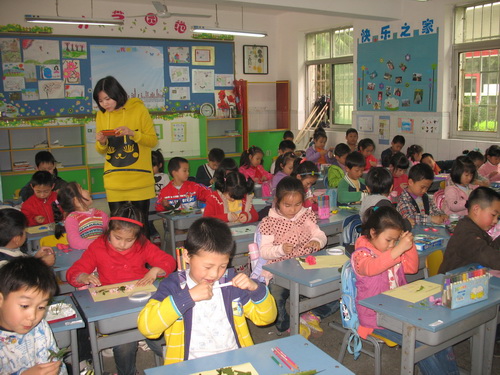 小朋友在认真做“叶片贴画”
