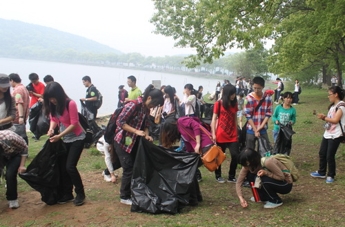 参加成人礼的学生在东湖边捡拾垃圾