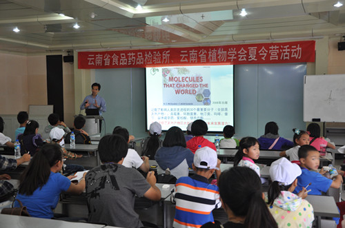 8月的昆明植物园,树木葱茏,芳草如茵,鸟语花香。由云南省食品药品检验所与云南省植物学会联合举办的2013年云南药检夏令营活动在中国科学院昆明植物研究所昆明植物园东园水生区大草坪举行开营仪式。昆明植物所所长、云南省植物学会理事长李德铢研究员,云南省食品药品检验所党委副书记、所长陈彬,云南省食品药品检验所党委书记、副所长刘惠,云南省植物学会秘书长赵俊芬等来宾出席了开营仪式。一百多位从幼儿园到大学不同年龄段的夏令营营员及部分家长参加了开营仪式。