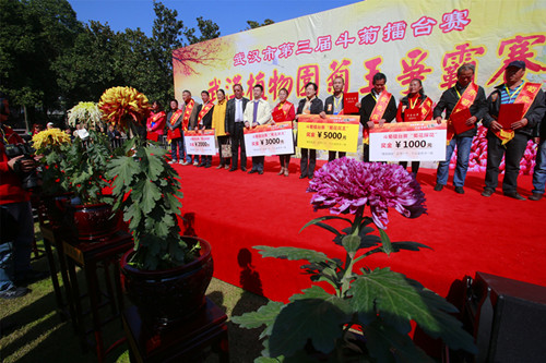 11月4日,由武汉市园林局、中囯科学院武汉植物园、武汉晚报共同举办的武汉市第三届斗菊擂台赛决赛精彩上演。10盆菊花打擂上演了精彩对决,最终,“紫龙献爪”拔得头筹,养护者张三军夺得了武汉市“菊花花王”的称号。当天上午,武汉植物园免费向市民开放,1.5万市民入园观赛共同见证了武汉市“菊花花王”的诞生。
