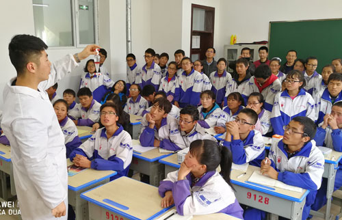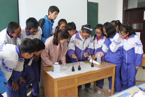 10月18日,民和县杏儿藏族乡日扎村中学九年级教室,90多名学生正聚精会神地关注一堂别开生面的化学课:如何在不用明火的情况下把物质点燃?只见来自青海盐湖所的博士黄东方手持一根细细的玻璃棒,先用玻璃棒在分别装有硫酸和高锰酸钾的两个烧杯中沾了一些液体,然后在另一个烧杯内放入沾有酒精的棉花,再用玻璃棒轻触棉花,棉花瞬间熊熊燃烧起来,在同学们的一片惊叹声中演示了玻棒点火的实验。这也是青海盐湖所在“科技扶贫,教育先行”的扶贫模式中再次走进少数民族地区贫困中学开展的微科研探究活动内容之一。