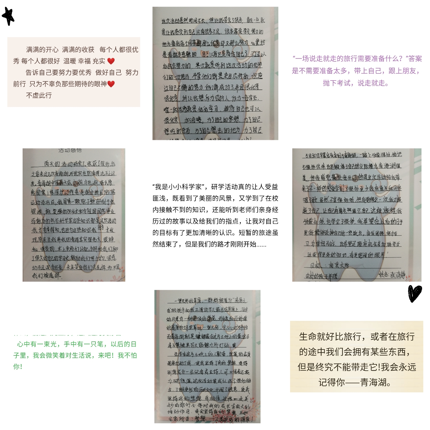 两天的活动,同学们也是收获多多,感悟多多,高一(12)班的张芯语同学在活动结束后这样写道:“我是小小科学家”研学活动真的让人受益匪浅,既看到了美丽的风景,又学到了在校内接触不到的知识,还能听到老师们亲身经历过的故事以及给我们的指点,让我对自己的目标有了更加清晰的认识。短暂的旅途虽然结束了,但是我们的路才刚刚开始......
