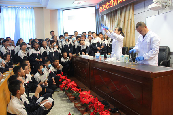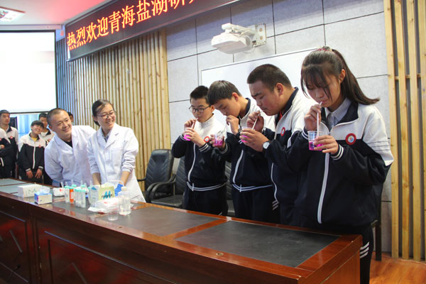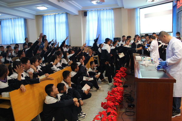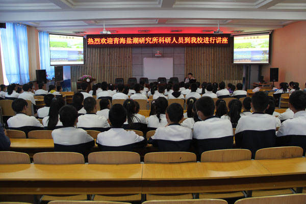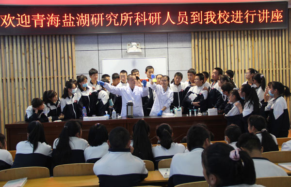 在校园,青海盐湖所的博士科普团队为中学生们讲述了盐湖故事,在《中国的盐湖》科普讲座中,形象生动地讲述了“什么是盐湖”“盐湖在哪里”“盐湖里有什么用”,使同学们对青海的特色优势盐湖资源有了初步的认识;开展了神奇的化学小实验,通过多彩化学、密码显形、黄金雨、催化放氧、铜树银枝、银镜反应等一系列精彩的科普实验,紧紧抓住“变化”这一核心,以极具震撼力的方式向同学们展示了化学之美和科学之美,为同学们开启科学世界的大门,激起他们探索科学世界的兴趣;医疗专家为同学们现场普及家庭急救知识和新冠疫情预防知识,现场演示了心肺复苏方法、正确的洗手方法及注意事项。无论是小实验还是急救现场演示,同学们踊跃主动,兴致勃勃,教室里不时发出阵阵惊叹声和掌声,活动取得了圆满成功。