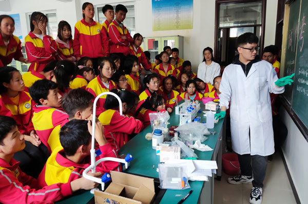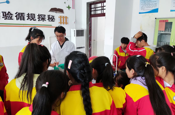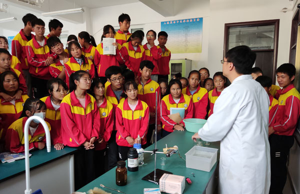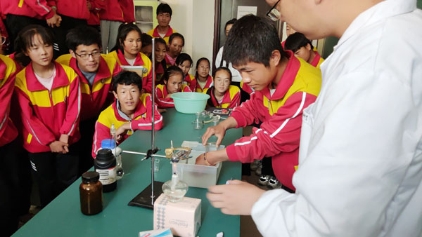 6月11日,青海盐湖所开展第三次扶贫扶智助力中考活动。在青海盐湖所党委的关心和支持下,3名博士研究生带着化学实验器材和试剂赶赴民和县杏儿乡中学开展化学实验演示和操作教学。
