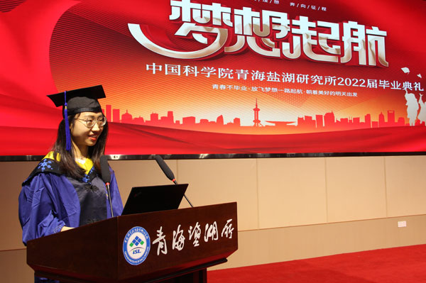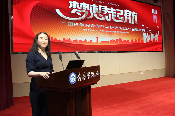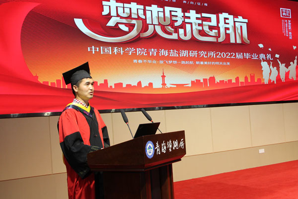 孙进贺研究员作为导师代表发言,他向毕业生及导师们表示祝贺,祝愿大家在今后的道路上披荆斩棘、脚踏实地、砥砺前行。白露同学代表毕业生发言,表达了对国科大、对青海盐湖所、对导师的感激与不舍,表示将牢记“盐湖精神”,在今后的工作中努力做到艰苦奋斗、无私奉献、团结拼搏、开拓创新,把“盐湖精神发”扬光大,并祝愿青海盐湖所越办越好,再创佳绩。