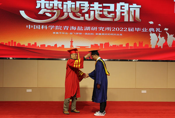 王建萍宣读了青海盐湖所关于拟授予卢晓航等3位同学博士学位、何海芳等22位同学硕士学位的决定。在大家热烈的掌声中,毕业生们依次上台,吴志坚一一为毕业生扶正流苏、颁发纪念品并与每一位研究生合影留念。