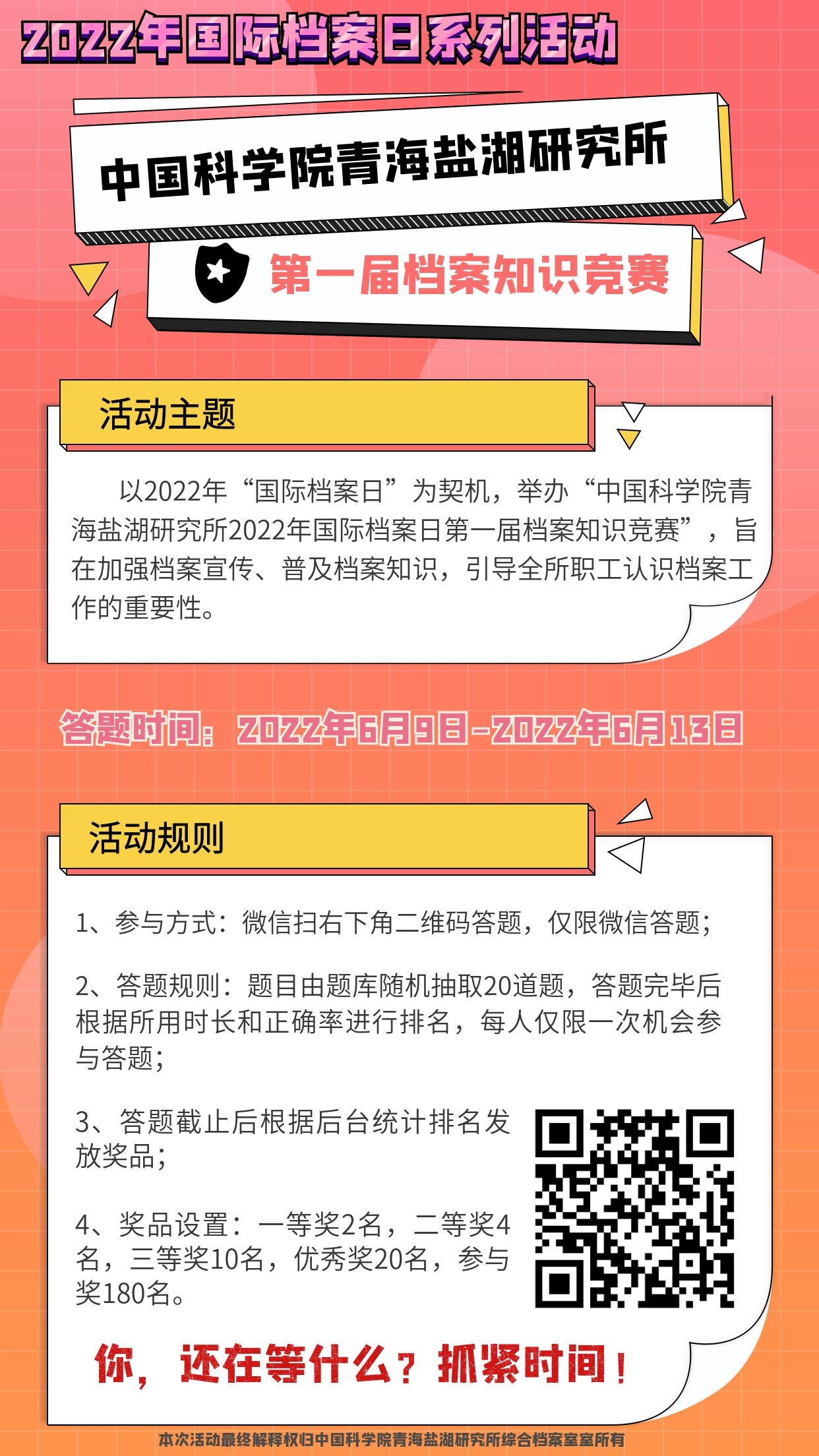 6月9日是第十五个国际档案日。为提升大家的档案意识,进一步了解档案对研究所发展的长远价值,青海盐湖所精心组织策划了以“喜迎二十大·从档案中传承盐湖精神”为主题的国际档案日系列宣传活动。活动为期一周,宣传内容包括《盐湖研究》创刊50周年刊物展、“我们的院士”“我们的荣誉”展、“盐湖精神星火相乘 点亮未来” 视频展播和档案知识竞赛。宣传活动采取了线上线下相结合的方式,取得了良好的宣传效果。