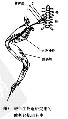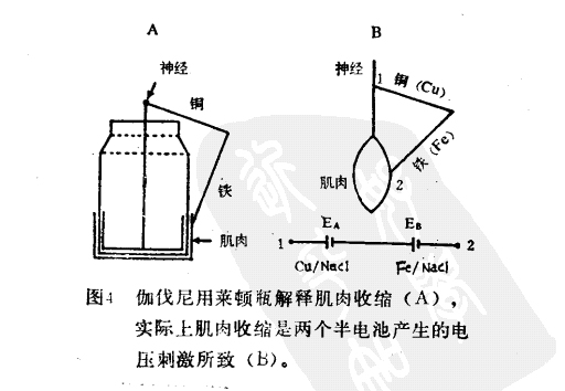 如果把蛀神经和肌内的组织液看作0.6%盐溶液,钢和铁电圾之间的电位差为450毫伏,足以引起青蛙神经兴奋。