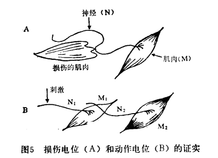 我们现在知道,活组织的损伤部位相对完好区域呈现负电性,这种电位差叫损伤电位,一般有50毫伏左右。把神经塔在有损伤区和完好区的肌肉上,它就受到损伤电位的刺激,使被其支配的肌肉发生收缩(图5.A)。这是后来由诺伯里证明的。他把娃的头砍掉,剥皮,然后将蛙脚放在盛有盐水的玻璃杯中,把躯干浸入另一杯盐溶液中;当用湿棉线把两杯溶液连接起来,陛的肌肉就发生收缩。显然,在这个系统中没有金属导线,所以肌肉的收缩由“动物电”刺激所致。诺伯里还把一些剥制好的青蛙串连起来,即把后面蛙的躯干放在前面蛙的腿上,这就构成了蛙“伏打电池组”。他用当时发明不久的电流计进行的测量表明,串连起来的蛙越多,得到的损伤电池就越大。这是人们首次用物理仪器演示出生物电流的存在。