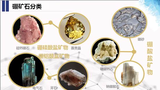 根据化学组成不同,可以将硼矿分成三类:硼硅酸盐矿物、硼铝硅酸盐矿物和碱金属及碱土金属的硼酸盐矿物。其中硼硅酸盐矿物主要有硅钙硼石和赛黄晶;硼铝硅酸盐矿物主要有电气石和斧石,但以上两类硼矿均不适宜进行工业开采,目前主要进行工业开发利用的是碱金属及碱土金属的硼酸盐矿物简称为硼酸盐矿物。硼酸盐矿物多达100多种,但能够作为工业硼资源开发利用的仅有10余种,其中典型的有天然硼砂、遂安石、硼镁石、硬硼钙石、天然硼酸、钠硼解石、柱硼镁石。