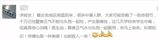 严格来说这条消息并不准确。我们服用的藿香正气水常用于外感暑湿引起的发热、胸闷、腹胀、吐泻,一般含40%~50%酒精(乙醇),和头孢类药物一起服用,可能产生双硫仑样反应。