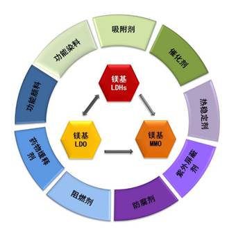 镁基水滑石是一类层状材料,由层间阴离子和带正电荷的层板堆积而成。具有层板金属离子、层间客体阴离子种类、数量可调,材料尺寸形貌可调等性质。特殊的结构赋予其丰富的性质和广泛的应用,镁基LDHs及其衍生物材料作为一类重要的镁基功能材料,在工业催化、塑料、橡胶、生物、环境、纺织等领域具有重要的应用。