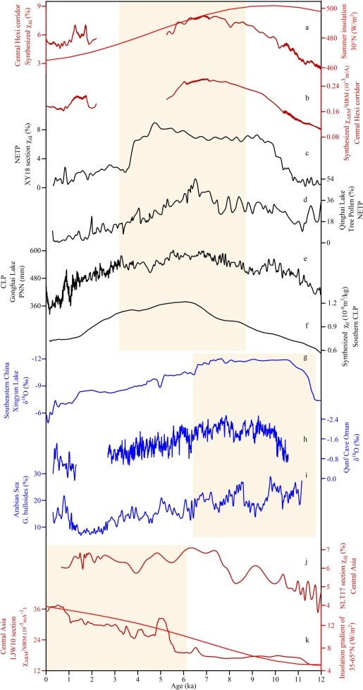 图2 过去25000年河西走廊气候与中亚和东亚气候的比较。(a)、(b):河西走廊中部地区磁化率记录;(c):XY18剖面磁化率记录(Li等人,2020b);(d):青海湖木本孢粉百分比(Shen等人,2005);(e):公海孢粉重建的年降水量记录(Chen等人,2015);(f):黄土高原南部磁化率记录(Kang等人,2020);(g):星云湖碳酸盐δ18O记录(Hodell等人,1999);(h):Qunf 洞穴石笋δ18O记录(Fleit - mann等人,2003);(i):阿拉伯海ODP 723位点Globigerina bulloides的丰度(Gupta等人,2005);(j):中亚黄土剖面NLT17的磁化率(Li等人,2020a);(k):中亚黄土剖面LJW10的磁化率(Chen等人,2016)。