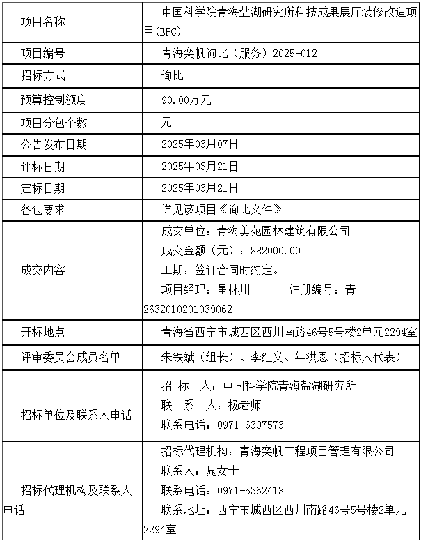 中国科学院青海盐湖研究所科技成果展厅装修改造项目(EPC)成交结果公告