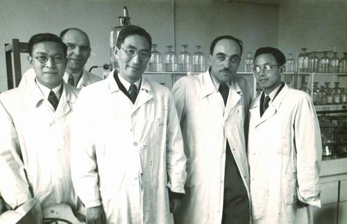 1959年3月,柳大纲(右三)代表中国化学会参加苏联门捷列夫百年纪念活动期间,在苏联有关化学实验室。