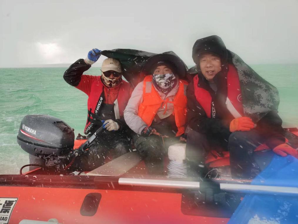 第二天早上,虽然大家没有充分休息好,但都早早起来开始做准备。在简单吃完饭后,大家便驱车来到雀儿茶卡湖边。将橡皮艇充气后,下湖的队员穿好雨裤和救生衣,抬起船向湖中走。由于湖水太浅,人一上船,船便搁浅了,没办法,几个人只能拉着船在湖里走,边走边按照设计好的点位进行取样。