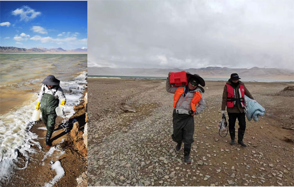 很快,高原便第一次正式对我们展示了它残酷的一面。在恰岗错,船刚下湖不久,狂风大作,巨大的风浪让我们不得不停止工作。更糟糕的是,船被吹向了彼岸,由于没有信号,我们与车辆也联系不上。无奈之下,我们只能穿着雨裤步行数公里返回驻地,这种高原负重跋涉的滋味真是难以言述。在孔孔茶卡工作时,老天也没给好脸色。一开始,温暖的太阳和平静的湖面让我们惬意不已,以为今天工作会很顺利。可是,当船快走到湖中央时,天空中突然乌云密布,大冰雹随即而来,铺天盖地砸在身上、脸上和手上,而大风浪则把大家的衣服全部浸透了。不仅如此,快速的降温让人不停地打寒颤,迅速失温是很危险的。当迎着浪头终于回到岸边时,天气却又突然晴朗起来。无语,这个玩笑开大了!而我也终于知道了:高原的天,娃娃的脸,说变就变。最终,我们还是克服了种种困难,顺利完成了这两个盐湖的工作。