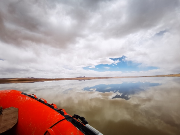果然,第二天一大早起来,天上阴云密布,不一会儿还飘起了雪花。但为了不耽误科考进度,我们还是收拾东西驱车前往热觉茶卡。行车途中,车窗外面隐约看到迎着风雪跃动的藏羚羊,心里油然升起对生命的敬畏之心。好在中午到达湖边时,乌云散去,湖面也难得风平浪静。机不可失,我们快速把船收拾好,便开始下湖。然而到了下午,大风又刮起来,队员们在风浪中小心翼翼的保持着船的平衡,采样工作愈加困难。幸好湖水不算太深,加上队员们已经有了一些经验,最终在傍晚时分顺利完成了当天的工作。尽管有些小磨难,但总算开了一个好头,大家心里都舒了一口气!