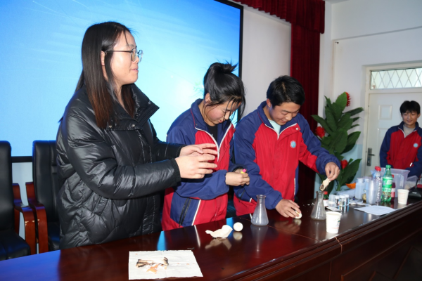活动现场,九三学社青海盐湖所委员会的刘红艳和郑卫新分别现场演示了《化学与生活》和《盐湖水泥材料的水化反应》系列精彩化学小实验,以极具震撼力的方式向同学们展示了化学之美和科学之美,极大激发了他们探索科学世界的兴趣。