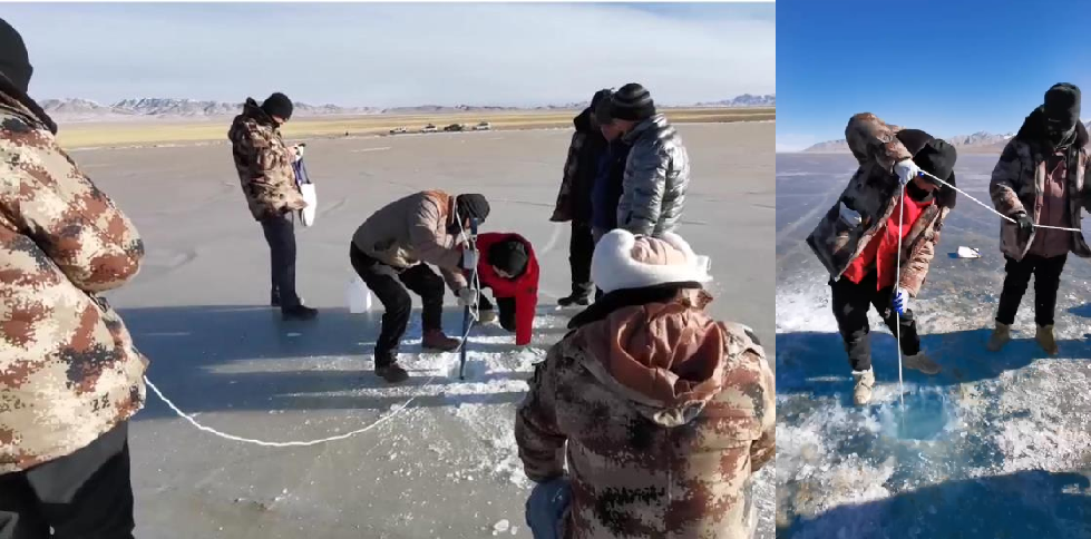 “三九四九不出手”,此时白天可可西里无人区的最高气温仅有零下15度,队员们需要拿着钢钎在湖面作业,湖面结冰厚达1米多,队员们克服严寒、铆足全身的劲咬牙把钢钎砸个十多次就开始上气不接下气了,气喘吁吁的换下一个队员砸钢钎,大家轮番作战。等湖水破冰而出时,队员们又要克服严寒,冲洗样品瓶,装样、封瓶。尽管戴着手套,但刺骨的湖水,冻得人只觉得钻心的疼。有的时候砸下去90cm左右仍不见湖水,意味着这番努力白费了,队员们需要继续前往更靠近湖中心的位置,重新砸,等待破冰时刻。需要采集湖底沉积物时,考验大家身心素质的不只是砸钢钎这项工作了,此时砸钢钎只是前奏,队员们轮番上阵,团结协作的用钢钎把冰面砸个大窟窿后,开始下重力钻,一个重力钻高达2米,重约20斤,砸到湖底采集到湖底沉积物后,比气喘吁吁砸钢钎更累的活才刚刚开始——拉装有湖底沉积物的重力钻孔。绳子被刺骨的湖水浸透拉到空气中迅速结成冰,湖深往往在10米以上,而太阳湖的钻取深度达到50多米,又是轮番上阵的接力赛,数着绳上的刻度咬牙坚持,不知何时队员们的双手双脚早已失去知觉,戴着眼镜的队员,镜片也结上了一层冰。湖底沉积物刚露出冰面,在短短的几分钟内就会结成冰,届时队员们相互配合封口,才算是完成了一个湖底钻孔的采集,短暂的松口气后,又背着沉重的工具前往下一个采样点。