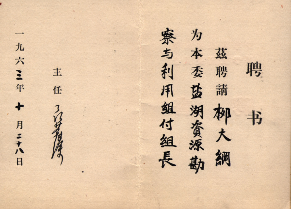 1963年10月聘请柳大纲先生为盐湖资源勘察与利用组副组长的聘书