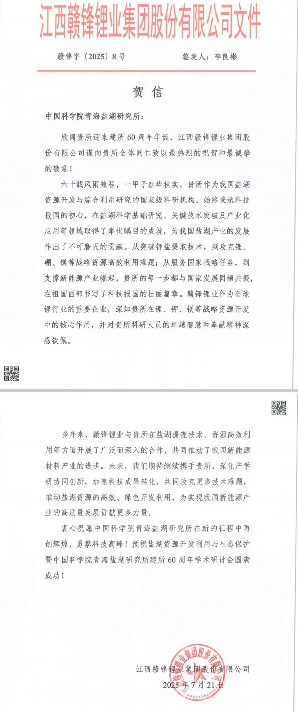 江西赣锋锂业集团股份有限公司贺信