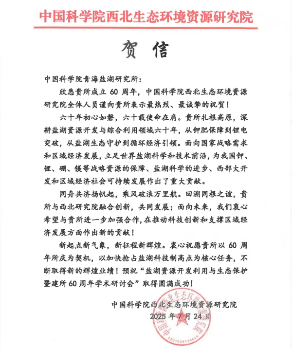 中国科学院西北生态环境资源研究院贺信