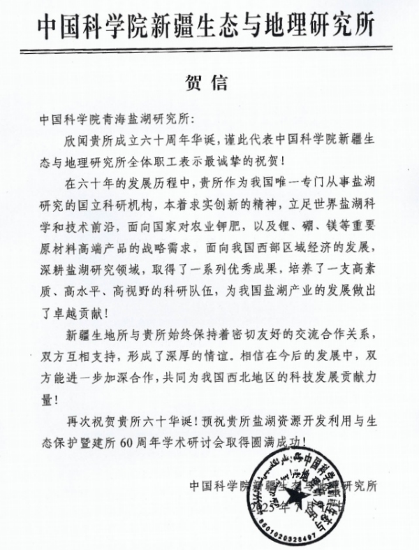 中国科学院新疆生态与地理研究所贺信