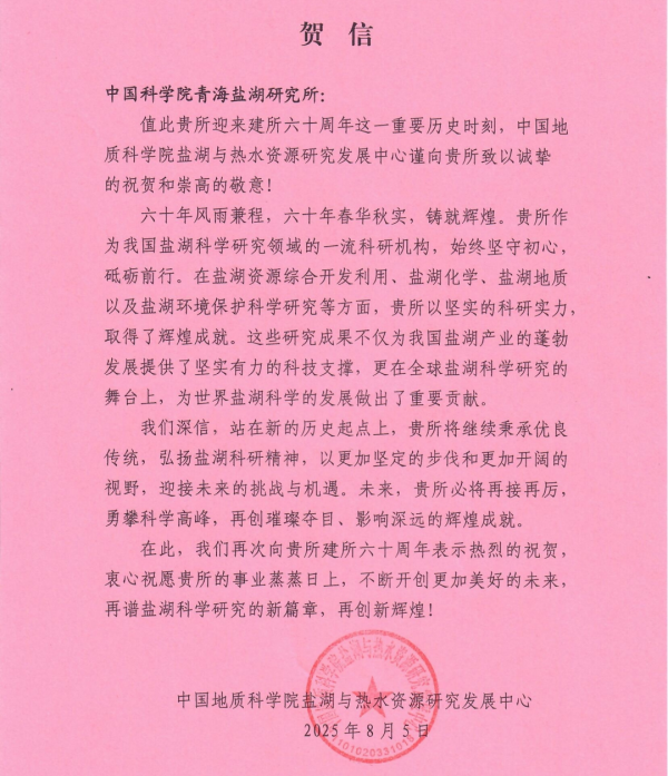 中国地质科学院盐湖与热水资源研究发展中心贺信