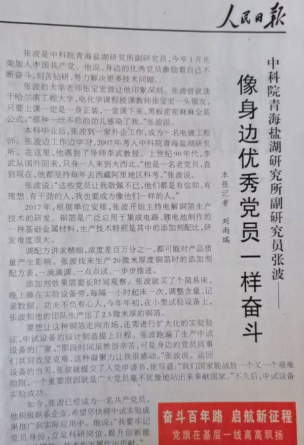 张波是中国科学院青海盐湖研究所副研究员,今年1月光荣加入中国共产党。他说,身边的优秀党员激励着自己不断奋斗,刻苦钻研,努力解决更多技术问题。
