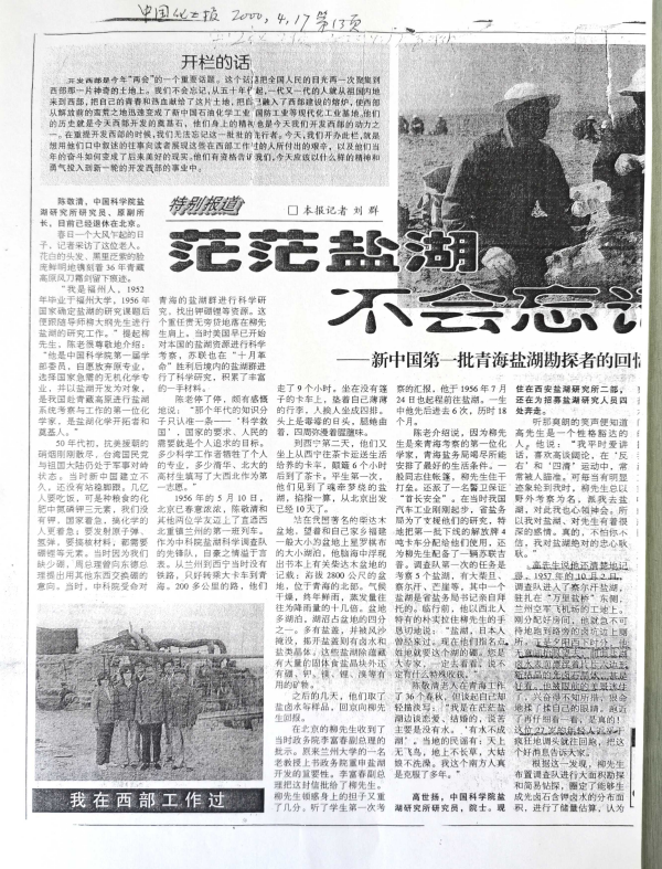 "我是福州人,1952年毕业于福州大学,1956年国家确定盐湖的研究课题后便跟随导师柳大纲先生进行盐湖的研究工作。"提起柳先生,陈老很尊敬地介绍:"他是中国科学院第一届学部委员,自愿放弃原专业,选择国家急需的无机化学专业,并以盐湖开发为对象,是我国赴青藏高原进行盐湖系统考察与工作的第一位化学家,是盐湖化学开拓者和奠基人。"