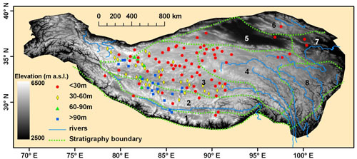 图1 青藏高原湖泊全新世最高湖面拔现在湖面高度图。
