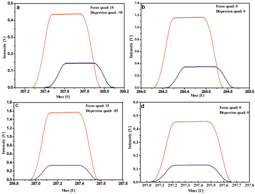 图. 静态双接收309(Cs211BO2+)/308(Cs210BO2+)质量扫描图 (a: 采用L1和C杯并使用ZOOM功能; b和c:采用H3和H4杯,不使用和使用ZOOM功能; d: 特制Triton B,不使用ZOOM功能)