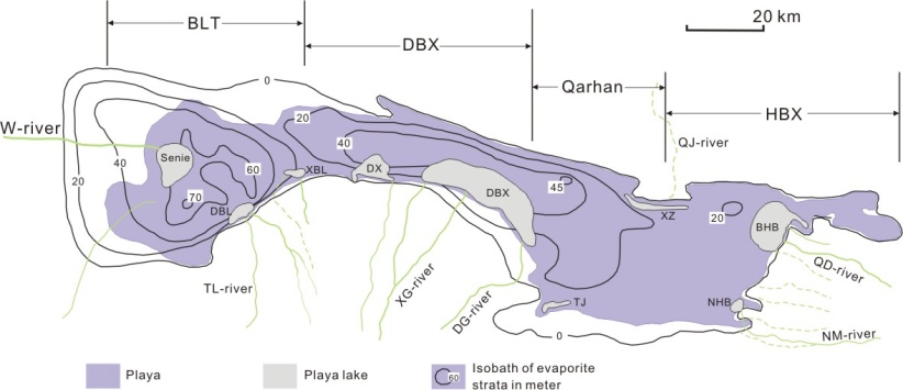 图示:察尔汗盐湖开发前蒸发盐地层等深图、干盐滩 (蓝色) 和现代盐湖 (浅蓝). 别勒滩与达布逊之间的地下隆升阻隔了含锂水的东移.