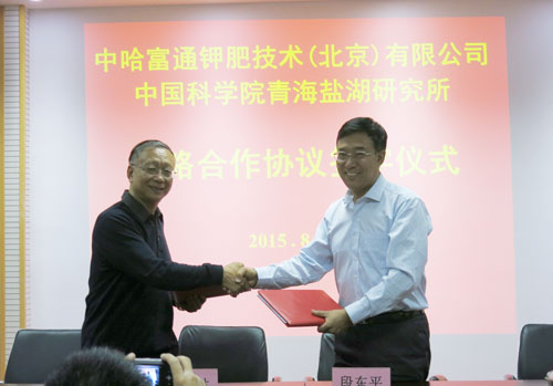 8月18日上午,青海盐湖所与中哈富通钾肥技术(北京)有限公司战略合作协议签字仪式在青海盐湖所举行。主持工作的副所长段东平与中哈富通钾肥技术(北京)有限公司总裁王宝林分别代表各自单位在合作协议书上签字。