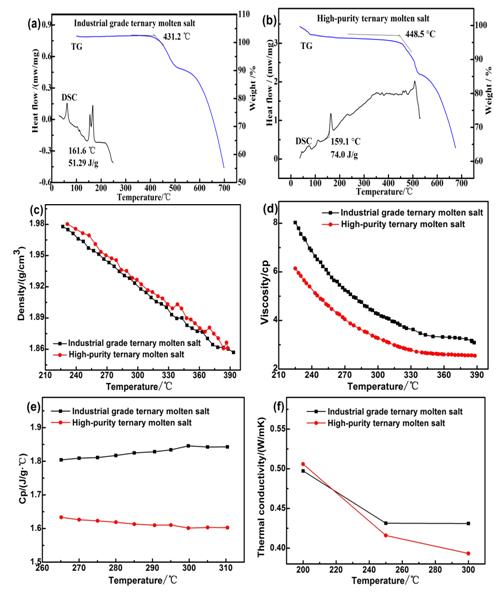 两种不同纯度NKM的热物性:(a)工业级三元盐TG-DSC;(b)高纯三元盐TG-DSC;(c)密度;(d)粘度;(e)比热;(f)导热系数