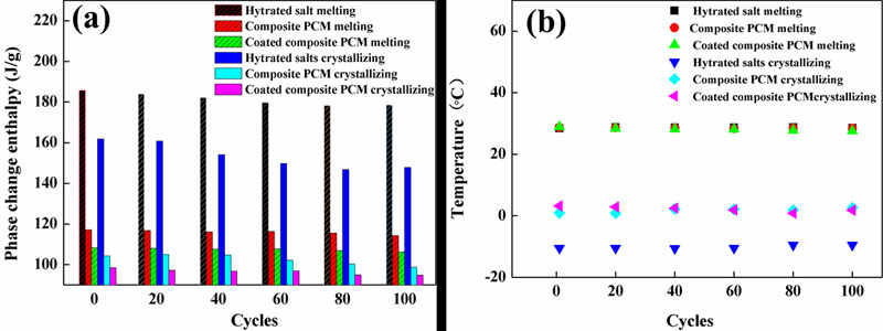 六水氯化钙,复合材料和包覆的复合材料在循环中焓值变化 (a)相变焓值 (b)相变温度