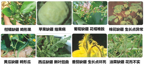 硼是高等植物特有的必需元素,它能够与游离状态的糖结合,使糖容易跨越质膜,促进糖的运输,对植物的生殖过程有重要的影响,与花粉形成、花粉管萌发和受精有密切关系。硼元素供应充足,植物籽粒饱满,根系良好;然而植物缺硼时症状差异较大,其共同特点是花发育不全、根系不发达、生长点死亡,导致产品和产量下降,甚至颗粒无收。
