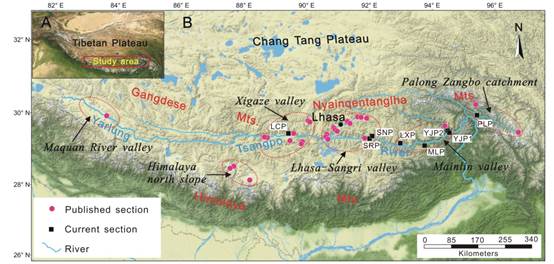 该研究是自2019年青海盐湖所承担的第二次青藏高原综合科学考察项目(Nos. 2019QZKK0602 & 2019QZKK0805)立项以来的首篇重要成果。该成果主要基于自然地理环境区域分异原理,从全流域视角分析了青藏高原雅鲁藏布江(图1)风成沉积发育年代的时空分异特征,讨论了风成沉积对全球气候变化及区域自然环境要素之间的关系。该研究旨在为青藏高原气溶胶、粉尘释放与人类环境安全研究提供背景资料;同时,在界定雅江流域风成沉积年代范围及空间差异,阐明高原河谷风成沉积与古气候响应,揭示其形成发育与印度季风、西风及高原季风盛衰变化消长关系等方面具有重要的意义。