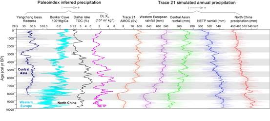 (图1)基于古气候记录与模拟数据的全新世期间亚洲季风与西风指标对比