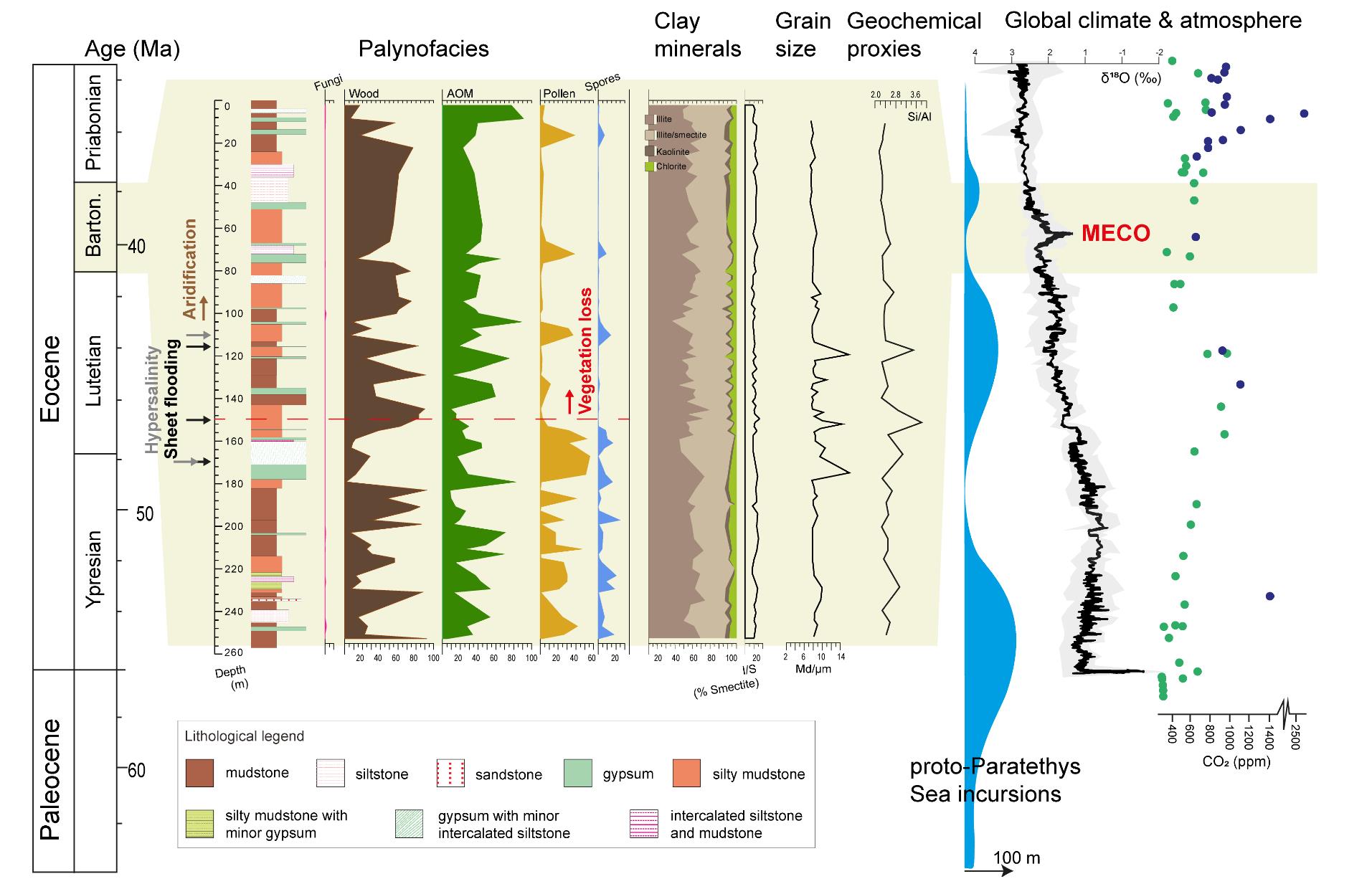 该研究是自2019年青海盐湖所承担的第二次青藏高原综合科学考察项目(Nos. 2019QZKK0805)立项以来的重要成果。青藏高原早新生代地层蕴藏的环境记录研究可以帮助我们获取青藏高原早期隆升的气候类型、了解亚洲季风和亚洲内陆干旱化的准确年代,演化规律及其背后的驱动机制。该研究首次对囊谦盆地新生代地层利用孢粉学高分辨率分析框定了地层沉积时代,采用孢粉相分析结合地球化学、碎屑岩粒度等多指标分析,重建了始新世中晚期该区古环境演变。探讨了中亚内陆干旱的驱动机制及区域环境对全球气候的响应过程;揭示始新世中晚期青藏高原北部和中南部形成不同植被的主要驱动因素;进一步加深对南亚季风起源和演化的认识和理解;并为40 Ma后亚洲干旱化提供进一步支持。